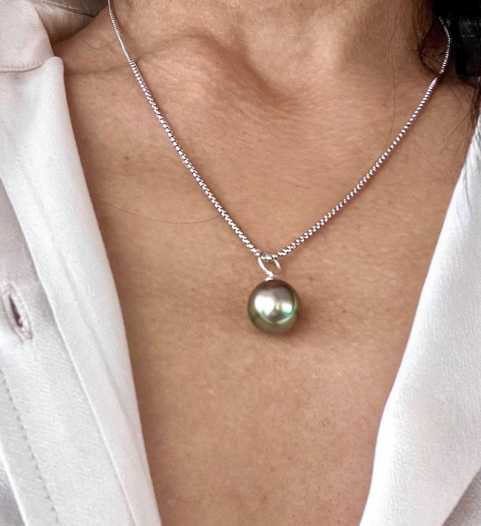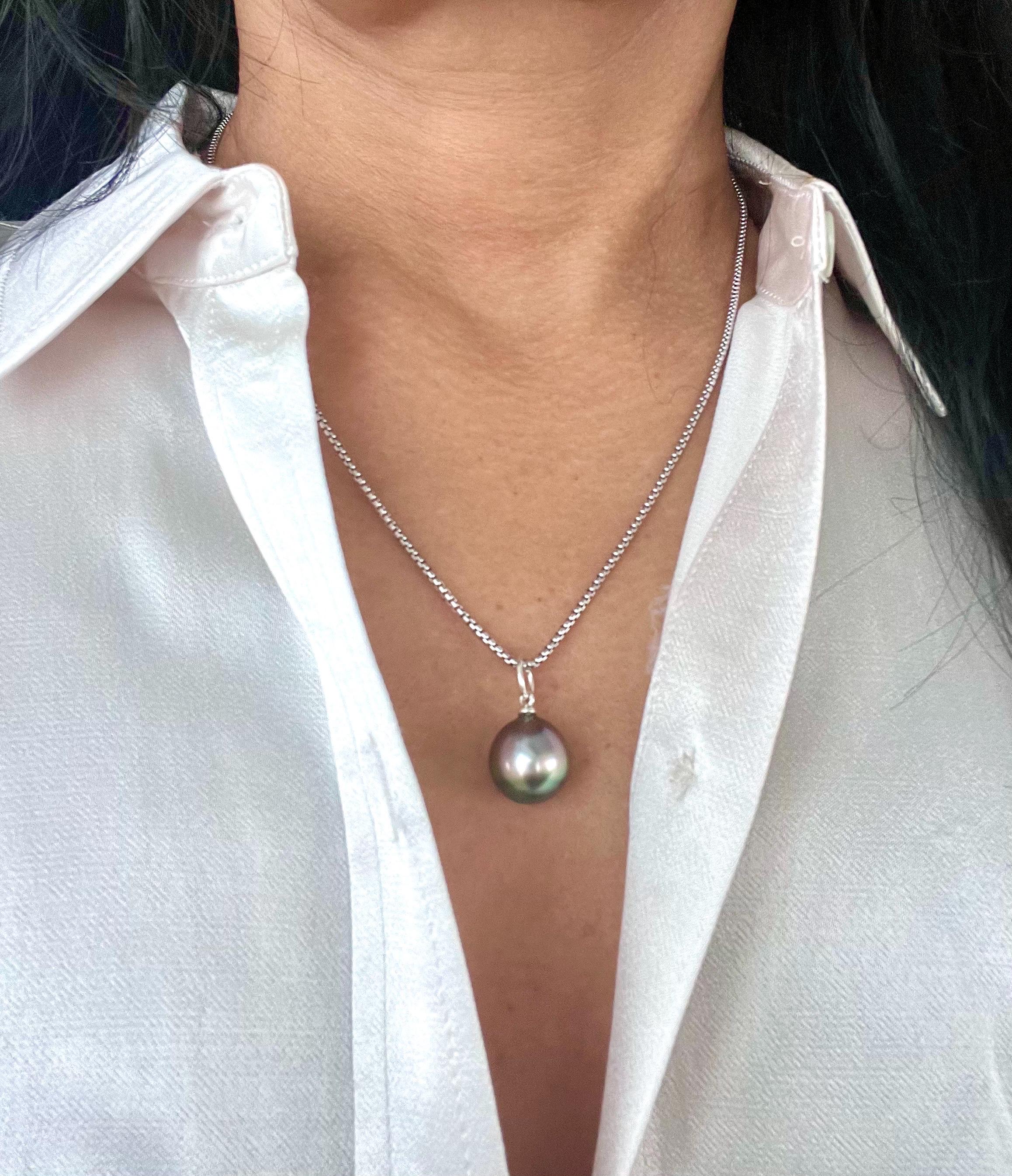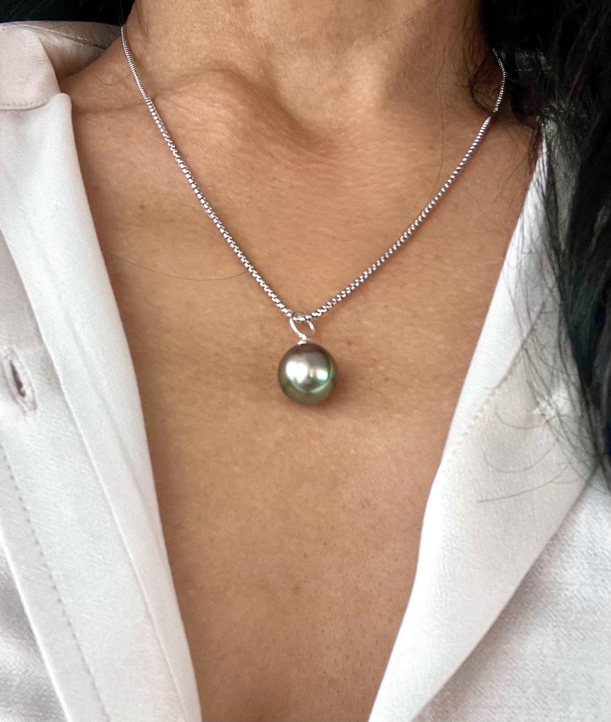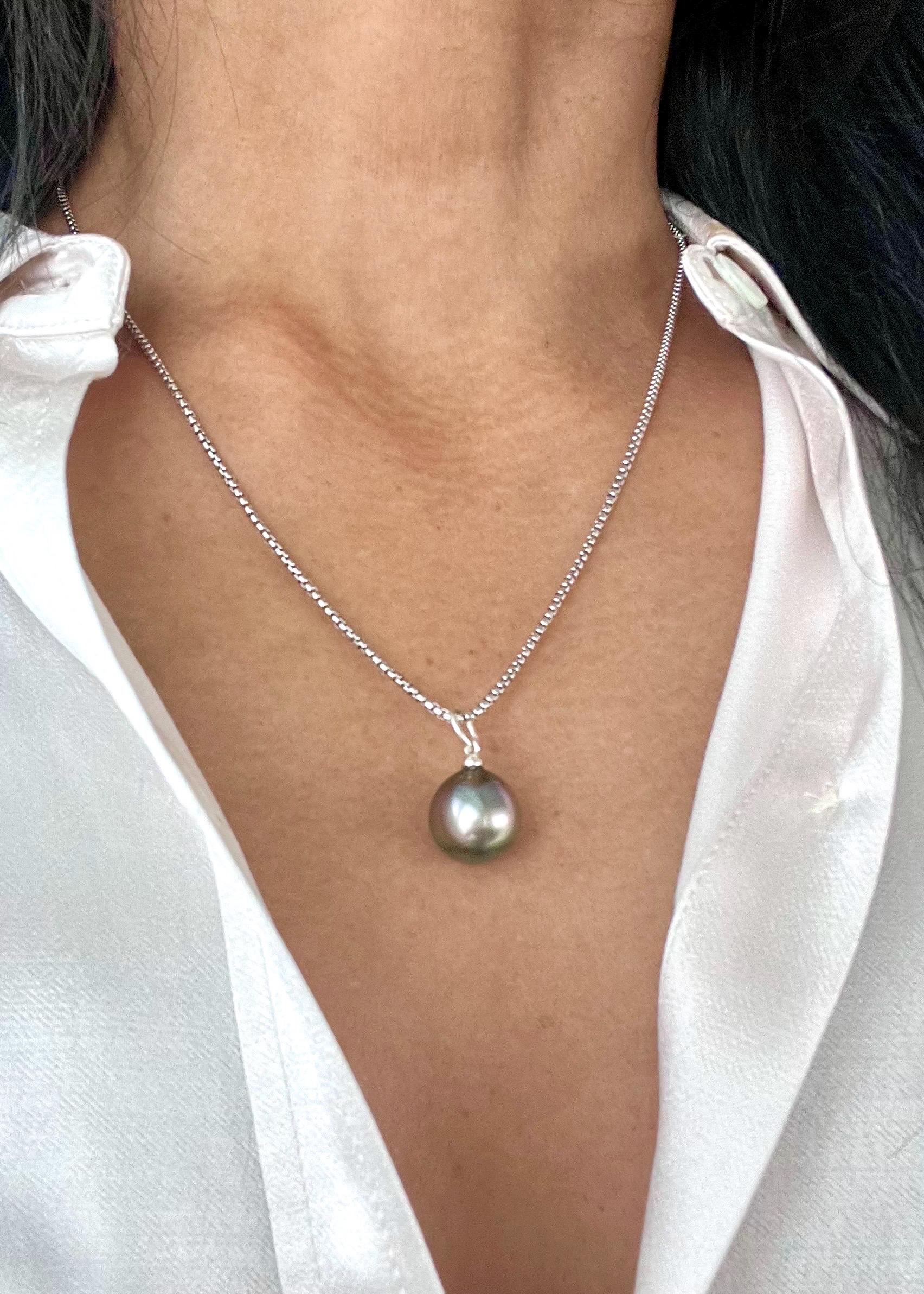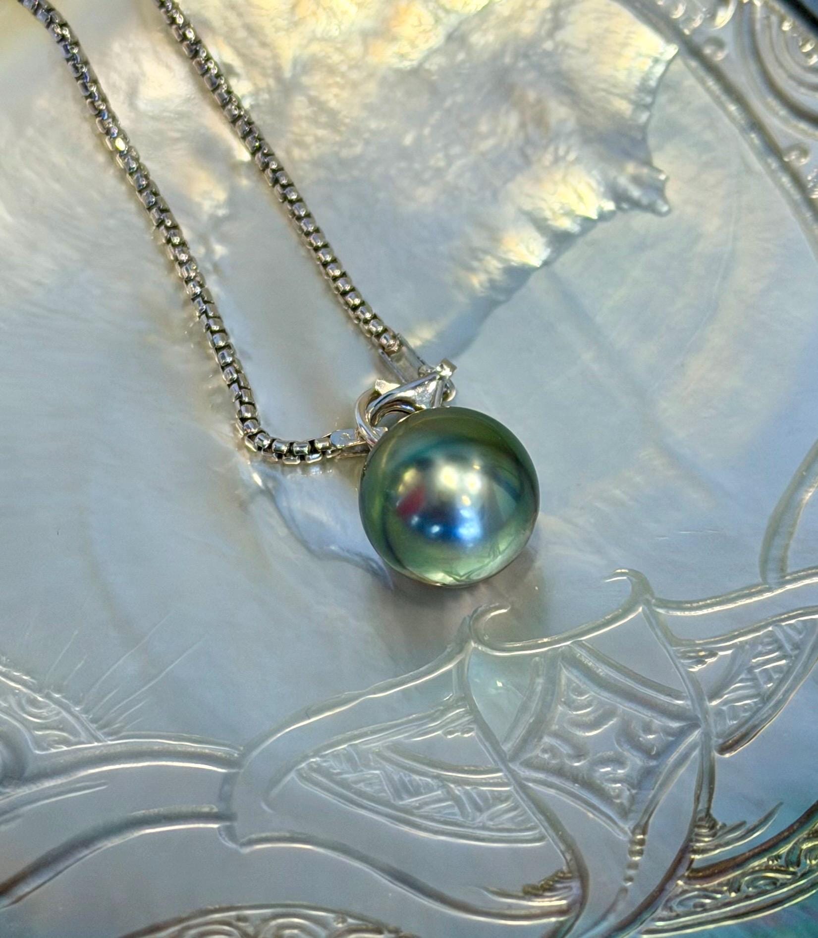 This amazing taihitian pearl displays a rainbow of electric blue, purple and green hues. It is a special, rare organic treasure and is sure to be a show stopper when worn with a white crisp shirt or your favorite dress! The pearl is set in sterling silver and measures 13mm-14mm.