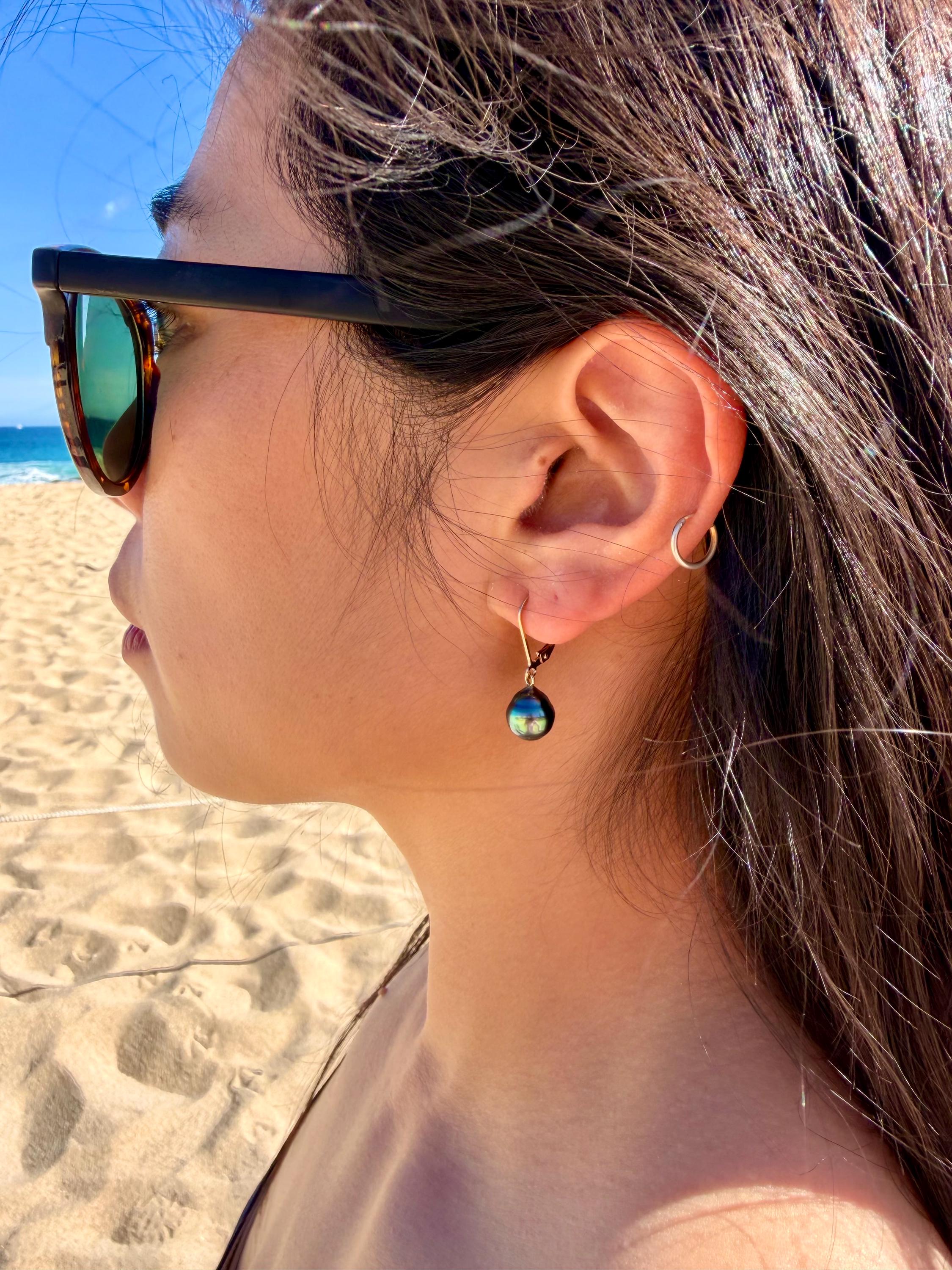 These lustrous tahitian drop pearl earrings exhibit a rainbow of colors of bright green, deep blue and purple. Stunning and beautiful, they are sure to be a showstopper when you wear them with your favorite dress or a crisp white shirt and jeans!
